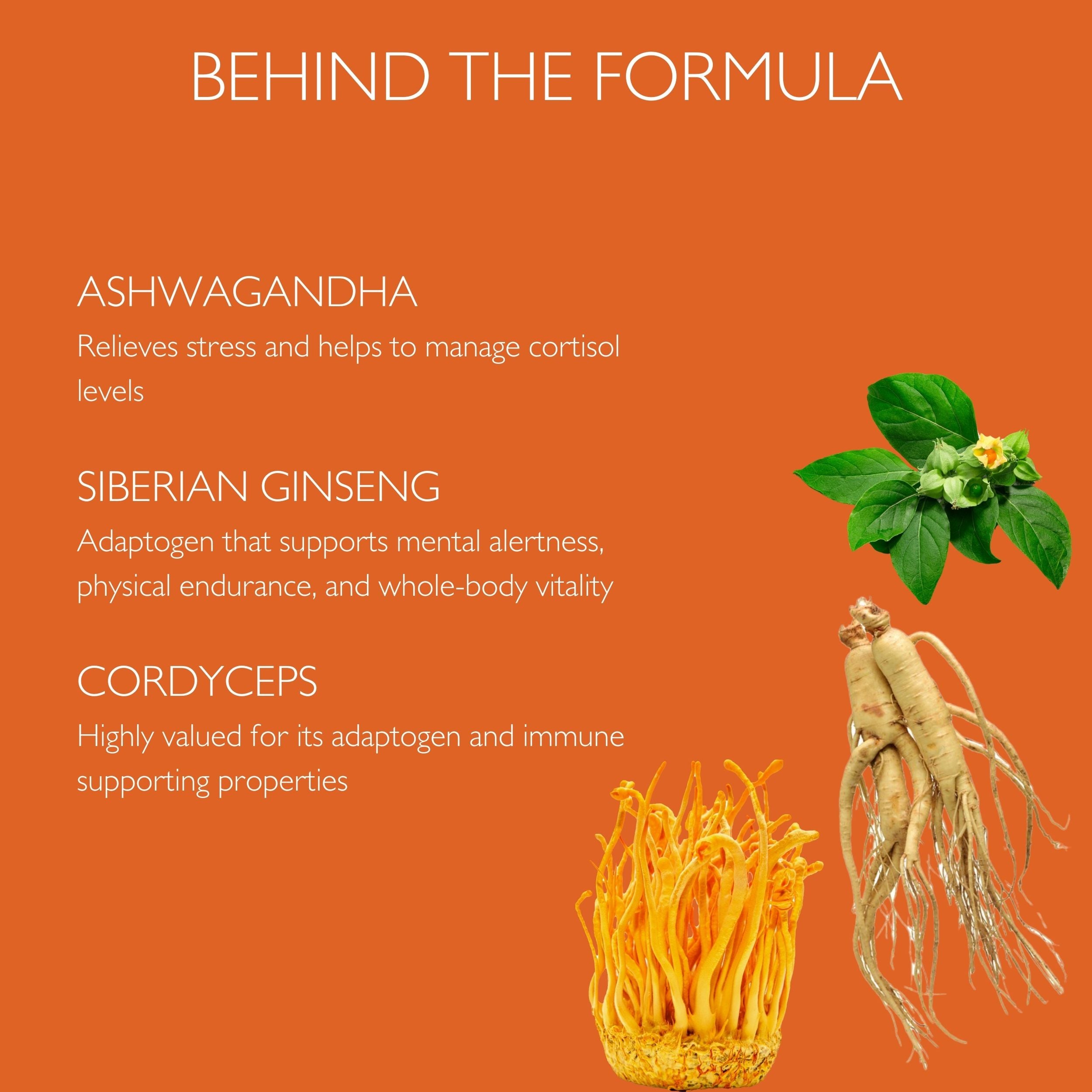 Ashwagandha (Withania somnifera)*, Oatstraw (Avena sativa)*, Siberian Ginseng (Eleutherococcus senticosus)*, Schisandra (Schisandra chinensis)*, Cordyceps (Cordyceps sinensis)*. Other Ingredients: Purified water, Ethanol*